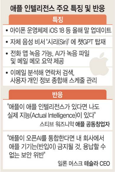 애플이 자체 인공지능(AI) '애플 인텔리전스(intelligence)'를 공개했지만 '먹을 것 없는 소문난 잔치'에 그쳤다는 평가가 나온다.