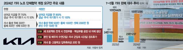 외부의 시선은 곱지 않다. 억대 연봉을 받는 기아 노조가 일반 직장인들은 상상하기 과도한 혜택을 요구하며 상대적 박탈감을 조성한다는 비판이다. 늘어난 직원 경조금 등에 따른 비용은 고스란히 소비자의 몫으로 돌아갈 것이란 우려도 적지 않다. 기아는 국내외 판매 부진으로 1~5월 누적 글로벌 판매량(128만 6111대)이 전년 동기보다 0.9% 줄어드는 등 불확실한 경영 환경을 타개해야 하는 과제를 안고 있다.