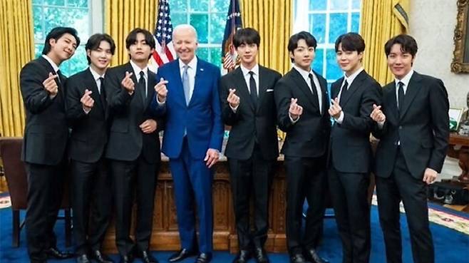 특히 BTS는 지난 2022년 조 바이든 미국 대통령과 사진 촬영 시에도 손 하트 포즈를 취한 바 있는데요.