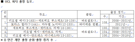 그렇다면 정답은? UEFA(유럽축구연맹) 챔피언스리그(UCL)와 연관을 짓는다면, 어느 정도 윤곽이 그려진다. 좀 더 외연을 좁혀 UCL 출장 경기 기록으로 들어가면, 답이 돌출된다. 2023-2024 UCL의 막이 내리면서 새롭게 형성된 적집합이다. IFFHS(국제축구역사통계연맹)가 최근 집계해 발표한 통계는 시선을 끌어당긴다.