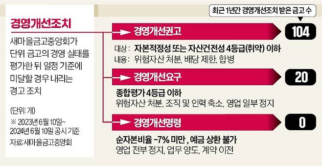 11일 한국경제신문이 전국 1284개 새마을금고의 수시공시를 전수 분석한 결과, 올 들어 경영개선조치를 받은 단위 금고가 68개에 달하는 것으로 파악됐다. 지난해 6월 이후 1년간 경영개선조치가 내려진 단위 금고는 124개다. 행정안전부와 새마을금고중앙회가 단위 금고의 경영개선조치 내역을 1년 이상 공개하지 않고 있어 전년 대비 비교는 불가능하다. 금융권에선 글로벌 금융위기 이후 가장 많은 금고가 경영개선조치를 받았을 것이란 관측이 나온다.