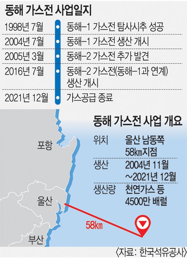 해당 관계자가 언급한 ‘동해 가스전’ 사업은 석유공사가 국내 최초로 성공한 시추 사업이다. 20년가량의 탐사 끝에 1998년 울산 남동쪽 58㎞ 지점에서 4500만 배럴 규모의 천연가스를 발견했다. 이후 2005년 추가로 발견된 ‘동해-2 가스전’과 함께 2004년부터 2021년까지 천연가스를 생산했다.