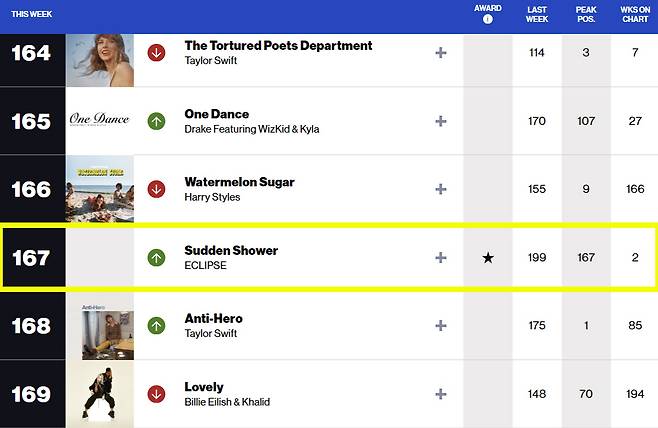 11일(한국시간) 미국 빌보드 공식사이트에 2024년 6월15일 주 빌보드 글로벌 200 차트에 따르면 이클립스의 '소나기'(Sudden Shower)는 순위가 급등했다.