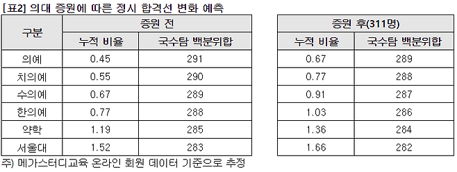 전년의 경우 △치의예과 290점(누적 비율 0.55%) △수의예과 289점(누적 비율 0.67%) △한의예과 288점(누적 비율 0.77%) △약학과 285점(누적 비율 1.19%) △서울대 283점(누적 비율 1.52%)으로 올해 지원 가능점수보다 1∼2점 높았다.