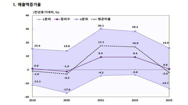 매출액 증가율은 2020년 -3.2%를 기록한 뒤 2021년 17.7%, 2022년 16.9%로 두 해 연속 증가세를 기록하다, 지난해 다시 마이너스로 돌아섰습니다.