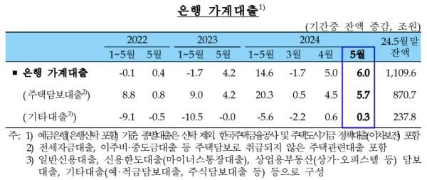 12일 한은이 발표한 '2024년 5월 중 금융시장 동향'을 보면, 지난달 중 은행 가계대출은 6조원 증가했다.