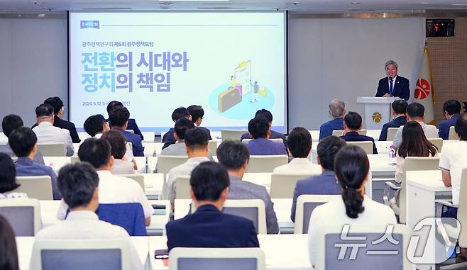 (광주=뉴스1) 박준배 기자 = 서왕진 조국혁신당 의원이 12일 광주시청 중회의실에서 열린 제5회 정책포럼에서 '전환의 시대와 정치의 책임'을 주제로 강연하고 있다.(광주시 제공)2024.6.12/뉴스1