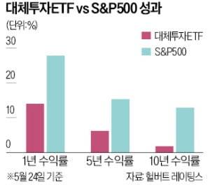 미국 증권정보업체 헐버트레이팅스에 따르면 대체투자 부문 50개 ETF의 성과를 분석한 결과 1년, 5년, 10년 평균 수익률 모두 S&P500지수 성과를 밑돈 것으로 나타났다.