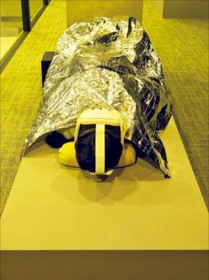 관짝 위에 눕혀놓고 미래의 묫자리부터 보여주는 전시회