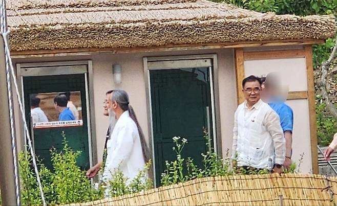 | ▲ 지난해 6월 10일 한산모시문화제 행사장에서 만난 천공(왼쪽)과 김기웅 서천군수가 함께 걷고 있는 모습. |