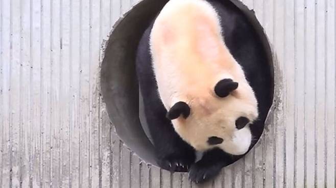 동그란 철문이 열리자 푸바오가 조심스레 방사장으로 발을 내딛습니다.