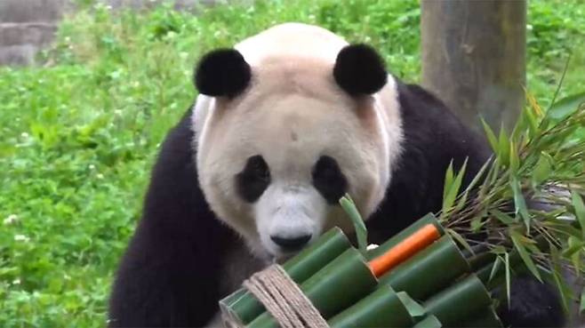 푸바오는 중국에서의 첫 일반 공개를 축하하기 위해 마련된 대나무 케이크를 하나씩 뽑아먹으며 특유의 먹성을 뽐냈습니다.
