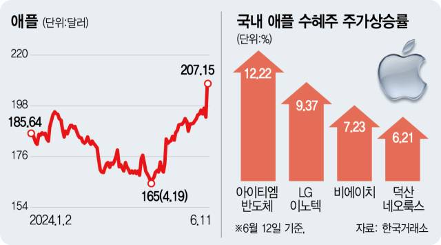 애플이 미국 뉴욕 증시에서 사상 최고가를 돌파하면서 애플의 밸류 체인에 속하는 LG이노텍(011070), 비에이치(090460), 아이티엠반도체(084850) 등 관련 종목이 관심을 끌었다. 전문가들은 애플이 향후 인공지능(AI) 산업 경쟁에서 앞서 나갈 수 있느냐가 이들 종목의 추가 상승을 좌우할 것이라고 진단했다.
