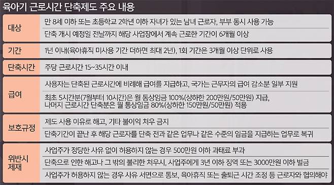 이 제도는 만 8세 또는 초등 2년 이하 자녀를 둔 근로자를 상대로 최대 1년(육아휴직 미사용 기간 포함 시 최대 2년) 동안 근로시간을 주 15~35시간 단축할 수 있는 권리를 부여한다. 도입 당시인 2008년만 해도 소득 감소가 부담스러운 근로자들이 육아휴직 대신 선택했는데, 2019년 육아휴직과 별도로 추가 1년간 쓸 수 있게 개정되면서 독립적인 제도로 자리를 잡았다. 사용 근로자에게는 통상임금의 80~100%의 단축 급여가 지급되고, 우선대상지원기업(상시근로자 500명 이하 제조업 등)에는 월 30만원의 보조금과 월 80만~120만원의 대체인력 지원금이 추가 지원된다.