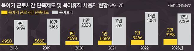 기업의 낮은 인지도와 근로자의 이용 부담감이 더해지면서 다른 가족친화정책과 비교해 제도 확산은 더딘 상태다. 고용노동부 자료를 보면 육아기 근로시간 단축 급여 수급자 수는 2019년 5660명에서 2020년 1만4698명, 2021년 1만6689명, 2022년 1만9466명으로 증가한 뒤 지난해 2만3188명으로 처음 2만명을 넘었다. 이용 대상이 동일한 육아휴직급여 수급자(지난해 12만6008명)의 18.4%에 그치는 등 활용률은 여전히 저조하다.