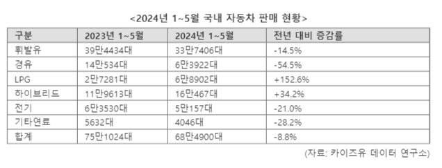 특히, 친환경차 선호가 확산되며 기아 카니발 하이브리드 모델은 계약 후 1년 뒤에나 차량을 받을 수 있을 정도로 큰 인기다. 반면, '캐즘'(대중화 전 일시적 수요 둔화)을 겪고 있는 전기차를 비롯해 전통적인 내연기관차인 휘발유와 경유 차량도 판매 침체가 깊어지고 있다.