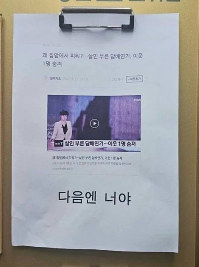 지난 12일 한 온라인 커뮤니티에는 ‘다음엔 너야’라는 경고 문구와 함께 실내흡연으로 이웃을 살해한 기사 스크랩 사진이 올라왔다. 해당 경고문이 게재된 단지는 경기도 안성시 소재 한 아파트로, 경고문 작성 주민은 이웃의 흡연으로 피해를 입고 있는 것으로 추정된다.