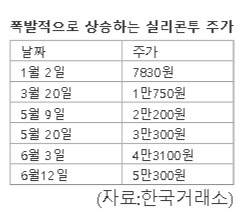 실리콘투는 올해 들어 주가가 557.59% 급등하며 중앙첨단소재(569.90%)에 이어 증시에서 두 번째로 높은 상승률을 기록하고 있다. 연초 7830원이던 주가는 3월 20일 1만원을 넘어서더니 5월 9일 2만원, 5월 20일 3만원, 이달 3일 4만원, 12일 5만원을 잇따라 돌파했다.