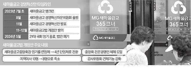 사상 초유의 새마을금고 뱅크런(대규모 예금 인출) 사태를 겪은 지 약 1년이 흘렀지만 관련 개혁 법안이 국회에서 무더기로 폐기되며 새마을금고 혁신 작업이 속도를 내지 못하고 있어서다.