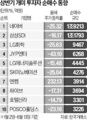 올 들어 개인투자자의 순매수 상위종목 10곳 중 9곳의 주가가 떨어진 것으로 나타났다. ‘저점 매수’ 전략이 좀처럼 먹혀들지 않은 것이다. 증권가에선 하반기 정보기술(IT)과 엔터주가 상승 반전을 시도할 가능성이 높다고 보고 있다. 2차전지 종목의 주가 회복엔 시간이 필요하다는 예상이 많다.