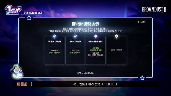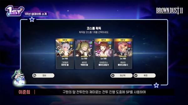 1주년 이벤트로 보상 뽑기 400연차가 제공된다. 김종호 사업실장은 "먼저 뽑기의 경우 1주년 신규 코스튬과 복각 코스튬 픽업으로 무료 뽑기가 약 200회 정도 되고 다양한 이벤트로 뽑기권 200장을 별도로 얻을 수 있다"고 설명했다.