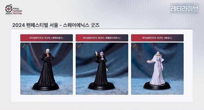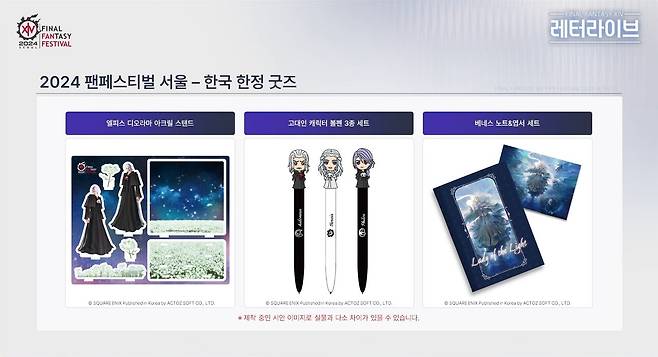 팬들의 관심이 집중된 스퀘어에닉스 굿즈로는 아젬의 크리스탈 키홀더, 하이델린&조디아크 마이스터 퀄리티 피규어, 상태 효과 핀뱃지, 피규어(에메트셀크, 휘틀로다이우스, 베네스, 레포릿), 아크릴 스탠드(빛에 감싸인 여성, 그라하 티아, 에스티니앙) 등이 판매될 예정이다.