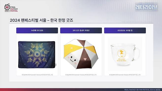 2024 팬페스티벌 서울 전용 굿즈 라인업으로는 엔드워커 집업 후드, 드리밍웨이 파티 티셔츠, 인벤팅웨이 파티 응원봉, 14번째 자리 담요, 뚱냥이 우양산, 초코초코보 시리얼 컵 등이 공개됐다.