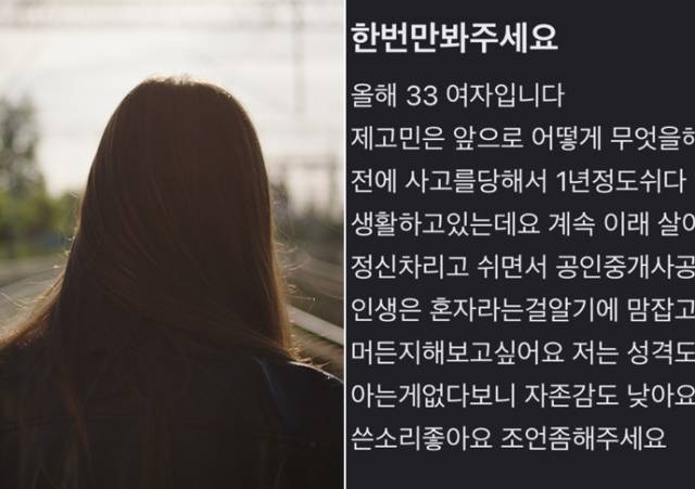 사고를 당했고, 그래서 1년 동안 일을 쉬었고, 현재는 아르바이트 3년 차. 글쓴이가 삶의 방향을 고민하게 된 이유입니다. 그는 “계속 이렇게 살아선 안 된다는 걸 알기에” “정신 차리고 뭐든지 해보고 싶어서” 글을 쓰게 됐다고 했습니다. 자격증 시험을 준비해 볼까 싶은데 내성적인 성격과 낮은 자존감이 걱정이라고, 아는 게 없어서 고민이라고 했습니다. 그러니 자신에게 ‘쓴소리’와 ‘조언’을 해달라고 부탁했죠.