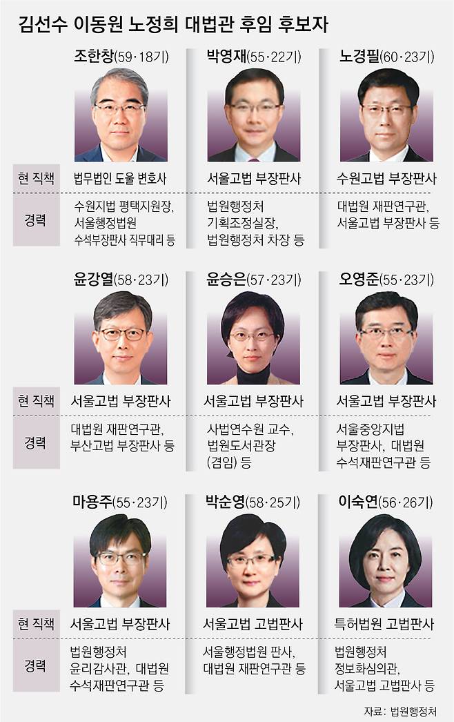 판사 출신인 조한창 법무법인 도울 변호사(59·사법연수원 18기)와 법원행정처 차장을 지낸 박영재 서울고법 부장판사(55·22기) 등 9명이 8월 1일 퇴임하는 김선수·이동원·노정희 대법관의 후임 후보자로 추천됐다. 8명이 현직 법관에 조 변호사까지 포함하면 9명 전원 전현직 법관 출신이다. 여성 후보는 3명으로 압축됐고, 검찰 등 비법관 출신은 후보에 오르지 못했다.
