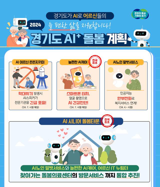도는 최근 이런 내용이 담긴 ‘경기노인 AI+돌봄 추진계획’을 발표했다(사진). 도는 ▲AI 시니어 돌봄타운 지정 ▲늘 편한 AI 케어 ▲AI 어르신 든든지키미 ▲AI 노인 말벗서비스 등 4개 사업을 시행하기로 했다.