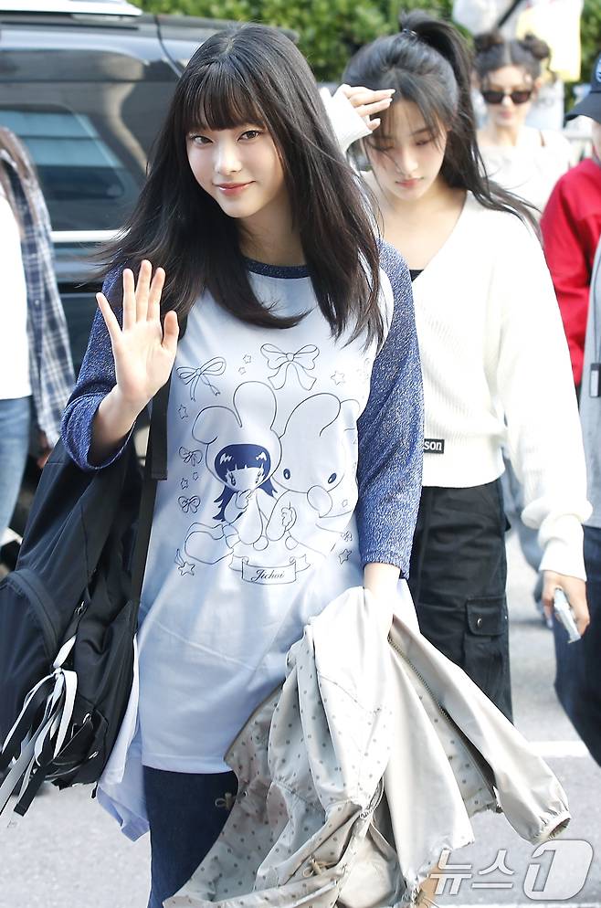 (서울=뉴스1) 권현진 기자 = 뉴진스의 해린이 음악방송 '뮤직뱅크'(뮤뱅)를 위해 14일 오전 서울 영등포구 KBS 신관 공개홀에 도착해 인사를 하고 있다. 2024.6.14/뉴스1