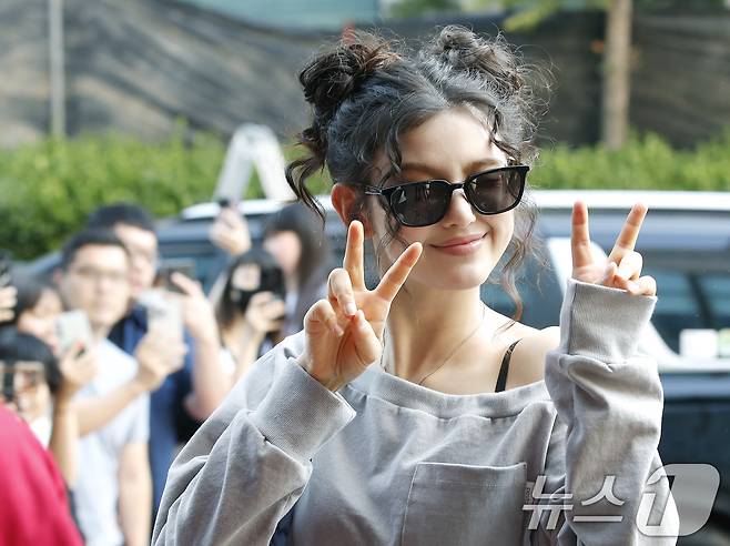 (서울=뉴스1) 권현진 기자 = 뉴진스의 다니엘이 음악방송 '뮤직뱅크'(뮤뱅)를 위해 14일 오전 서울 영등포구 KBS 신관 공개홀에 도착해 인사를 하고 있다. 2024.6.14/뉴스1