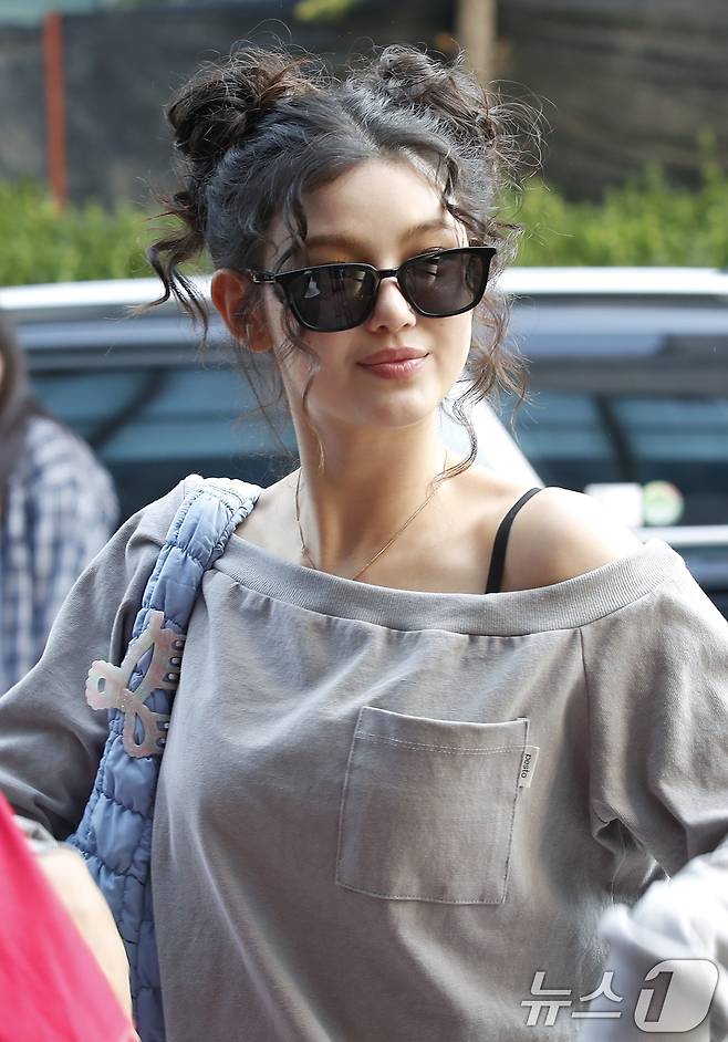 (서울=뉴스1) 권현진 기자 = 뉴진스의 다니엘이 음악방송 '뮤직뱅크'(뮤뱅)를 위해 14일 오전 서울 영등포구 KBS 신관 공개홀에 도착해 이동을 하고 있다. 2024.6.14/뉴스1
