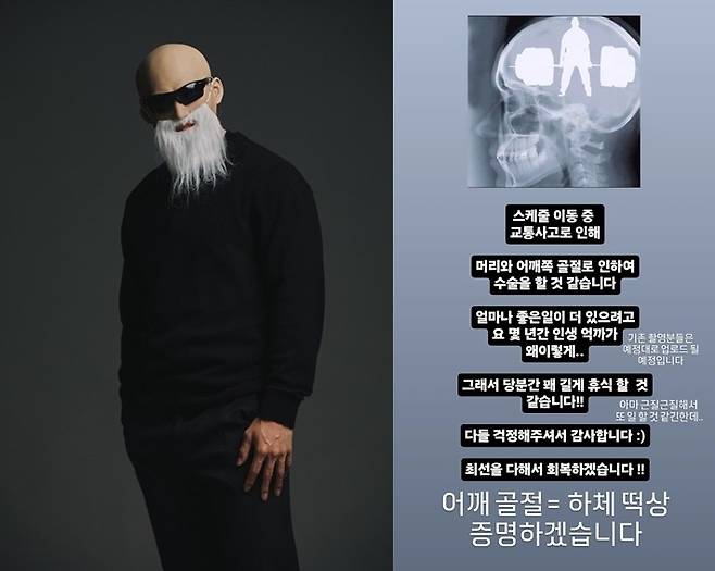 "교통사고가 나서 머리와 목, 어깨 쪽 골절로 수술할 거 같다. 머리 쪽은 뇌진탕 증상이 있어 지켜봐야 하고 어깨는 골절이 돼 재활해야 한다"고 근황과 상태를 알린 후, 자신을 향한 사망설에 대해 이야기했다.