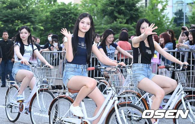 그룹 캔디샵이 자전거를 타고 방송국으로 이동하고 있다. 2024.06.14 /sunday@osen.co.kr