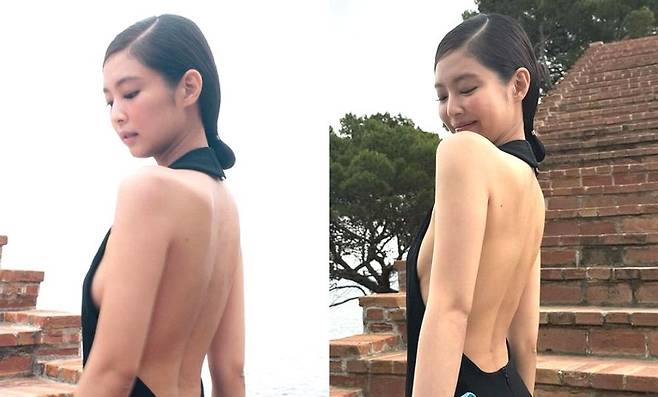 제니는 자신의 뒷모습을 촬영한 사진도 공개했다. 등이 완전히 드러난 드레스는 제니의 트레이드 마크인 직각 어깨를 강조하고 있다. 바닥을 응시한 채 귀엽게 미소 짓는 제니의 얼굴은 섹시한 몸매와는 상반되는 매력을 뽐냈다.