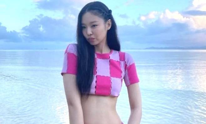 당시 제니는 밑가슴이 드러난 체크무늬 상의와 허리선이 낮은 로우라이즈 치마를 착용해 가녀린 허리를 자랑했다.