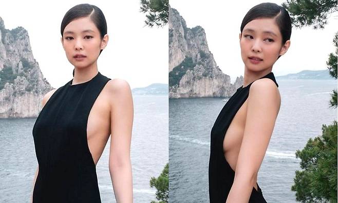 공개된 사진에서 제니는 우아한 검은색 홀터넥 드레스를 착용하고 있다. 제니는 옆면이 과감하게 파여진 드레스를 착용해 최근 트렌드인 '사이드붑'을 제니만의 감성으로 재해석했다.
