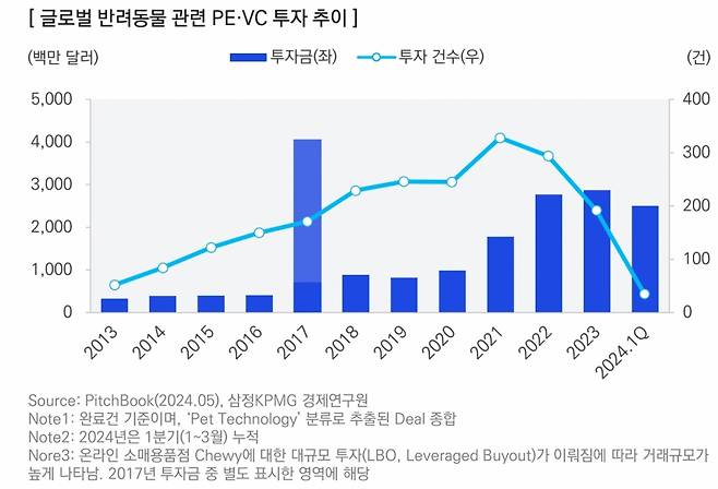 14일 삼정KPMG가 발표한 '다가오는 펫코노미 2.0 시대, 펫 비즈니스 트렌드와 새로운 기회' 보고서에 따르면 지난해 반려동물 기업에 대한 글로벌 투자금은 28억7000만달러(약 3조9514억원)로, 10년 전(2013년 3억2600만달러, 약 4488억원)보다 약 9배 가량 급증했다. 불안정한 자본시장에서도 성장성과 수익성 확보가 가능한 반려동물 시장에 투자가 집중되고 있는 것으로 풀이된다.