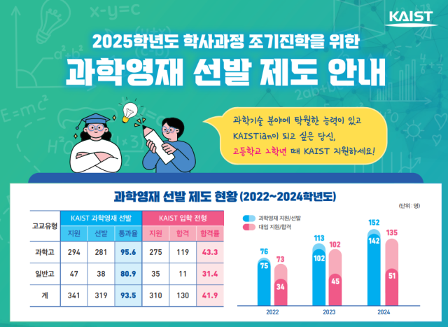 최근 3년간 과학영재선발제도에 341명이 지원해 319명(93.5%)이 선발됐다. 이중 130명이 학사과정 입시전형에 최종 합격했다. 합격 후 KAIST에 등록하면 남은 고교과정을 마치지 않아도 고졸 학력을 인정받는다. 장병규 크래프톤 의장, 김범준 네이버 최고운영책임자(COO), 인공지능 분야 석학인 조경현 뉴욕대 교수 등이 이 제도를 통해 KAIST에 조기 입학했다.
