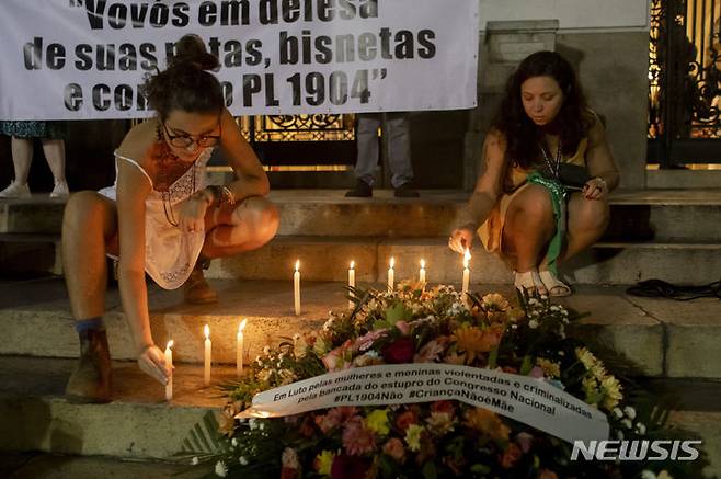 [리우데자네이루=AP/뉴시스] 13일(현지시각) 브라질 리우데자네이루에서 브라질 의회의 낙태 금지 법안에 반대하는 낙태 권리 옹호 운동가들이 촛불을 밝히고 있다. 2024.06.14.