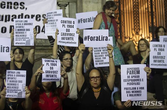 [리우데자네이루=AP/뉴시스] 13일(현지시각) 브라질 리우데자네이루에서 브라질 의회의 낙태 금지 법안에 반대하는 낙태 권리 옹호 운동가들이 손팻말을 들고 시위하고 있다. 2024.06.14.