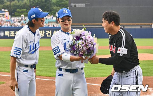 이어 이닝이 끝난 뒤에는 LG 주장 김현수와 구자욱이 다시 축하 꽃다발을 전달하는 행사와 기념사진을 촬영하는 등 양 팀 선수들이 축하의 뜻을 전했다.
