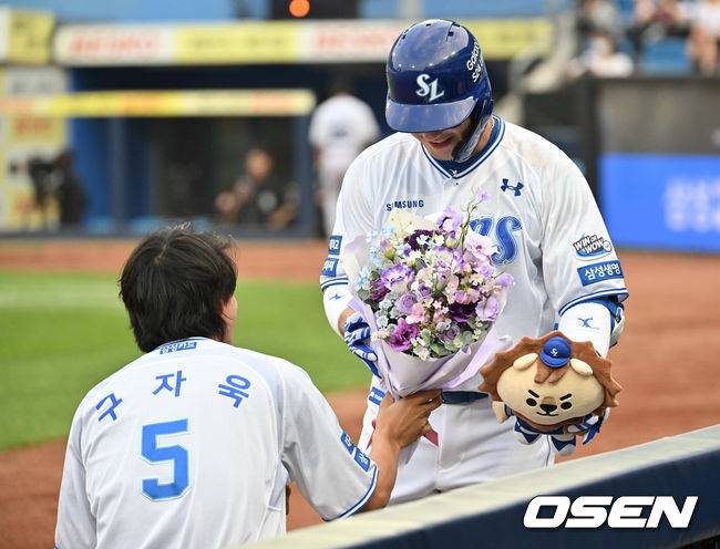 구자욱은 박병호와 마주한 순간 무릎을 꿇으며 마치 연인에게 프러포즈하듯 축하 꽃다발을 건넸다.