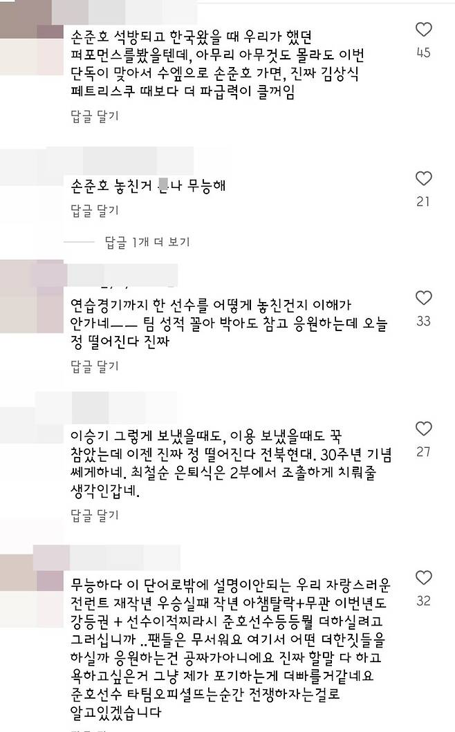 한 팬은 "지금 이 타이밍에 릴스나 올릴 생각을 하다니 최악"이라고 꼬집는가 하면, 또 다른 팬은 "손준호의 협상 결렬에 대해 팬들에게 충분한 설명을 하라"고 목소리를 높였다. 다른 팬은 "도대체 손준호에게 무슨 짓을 했느냐. 손준호만큼 전북에 진심인 선수가 어디있느냐"고 울분을 토하기도 했다. 또 한 팬은 "오늘 부로 전북 축구는 죽었다"며 강한 반발심을 드러냈다.