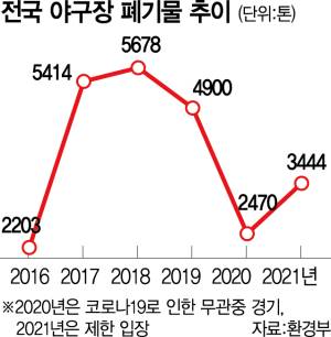 환경부에 따르면 2021년 기준 전국 야구장에서 발생한 폐기물의 양은 코로나19로 인한 제한 입장에도 불구하고 3444톤으로 2016년(2203톤)보다 56% 늘었다. 음식물이 묻은 일회용기, 페트(PET)인지 고밀도폴리에틸렌(HDPE)인지 소재가 표기되지 않은 야구방망이형 응원 막대처럼 재활용이 어려워 종량제 쓰레기로 버려지는 폐기물이 태반이다.
