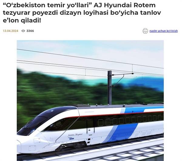 <우즈베키스탄 데일리>(UzDaily.com)은 지난 4월 13일 "현대로템의 고속철도 차량의 외관 디자인 공모전이 우즈베키스탄 철도공사 홈페이지에서 발표됐다"고 보도했다. 같은날 우즈베키스탄 철도공사 홈페이지에 올라온 공지를 보면, 외관 디자인 공모의 대상이 "현대로템 열차"로 명시돼 있고 KTX-이음과 거의 비슷한 모양의 측면·정면 도면도 첨부돼 있다.