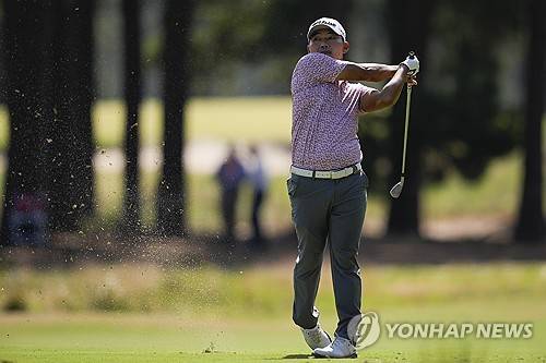 Sung Kang, of South Korea, hits from the fairway on the 11th hole during the second round of the U.S. Open golf tournament Friday, June 14, 2024, in Pinehurst, N.C. (AP Photo/George Walker IV)