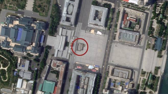 | 푸틴 방북 앞두고 김일성광장에 무대 구조물 블라디미르 푸틴 러시아 대통령의 방북을 앞둔 13일 북한 평양 김일성광장을 촬영한 위성사진. 광장 연단 앞에 대형 외벽이 등장했고 무대로 추정되는 물체(원 안)가 포착됐다. 플래닛랩스 제공 |