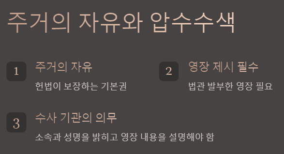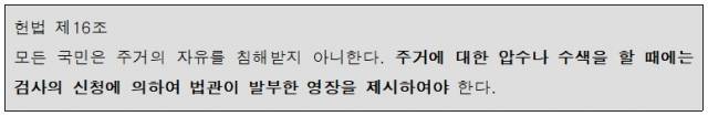 물론 집주인의 허락 없이 함부로 남의 집에 들어갈 수는 없습니다. 허락 없이 들어가면 주거침입이 되지요. 주거의 자유는 헌법이 보장하고 있는 중요한 기본권이기 때문입니다. 그러나 수사기관은 같은 헌법 조항에 따라 영장이 있다면 집주인의 허락과는 상관없이 들어갈 수 있습니다.